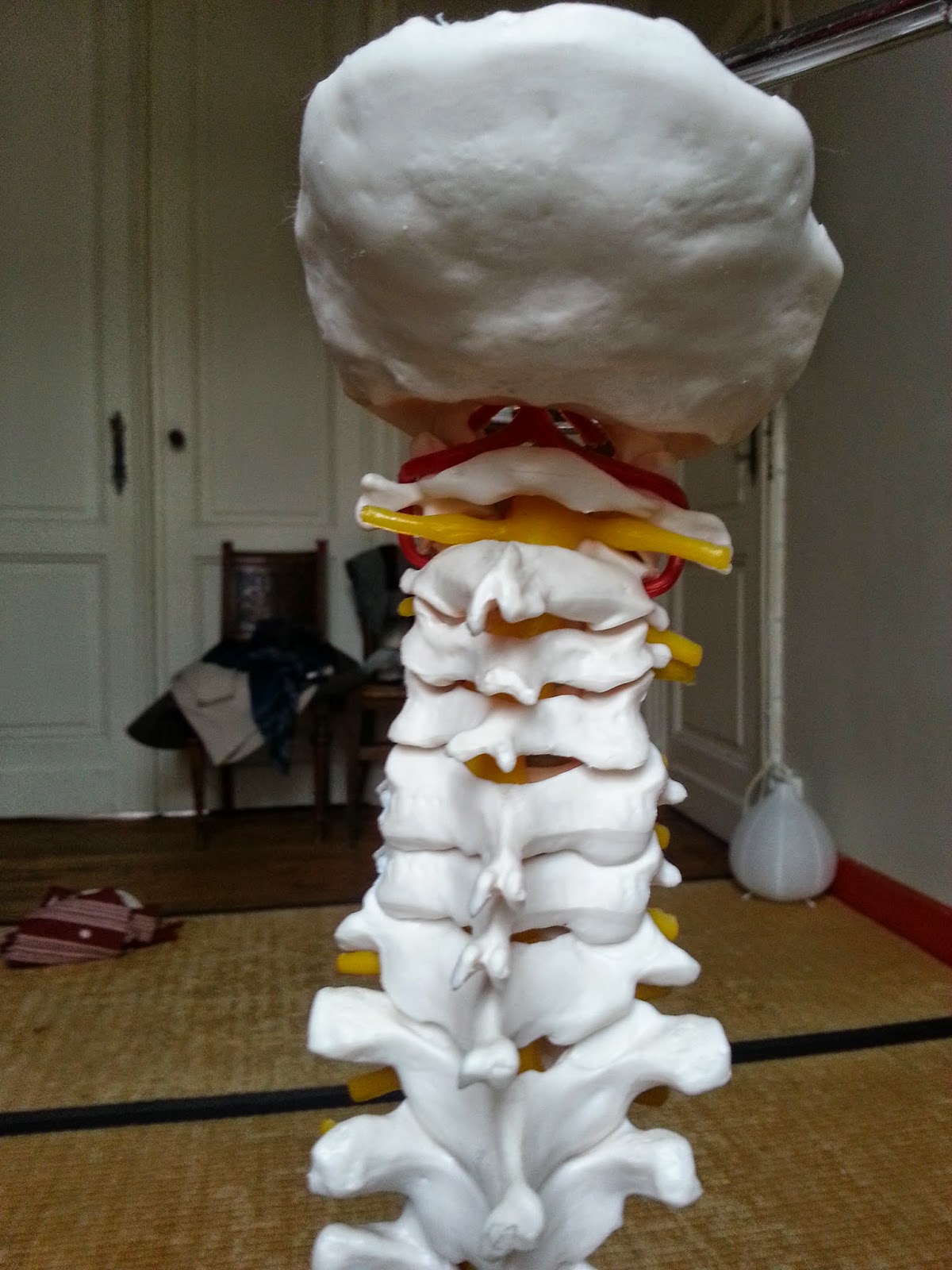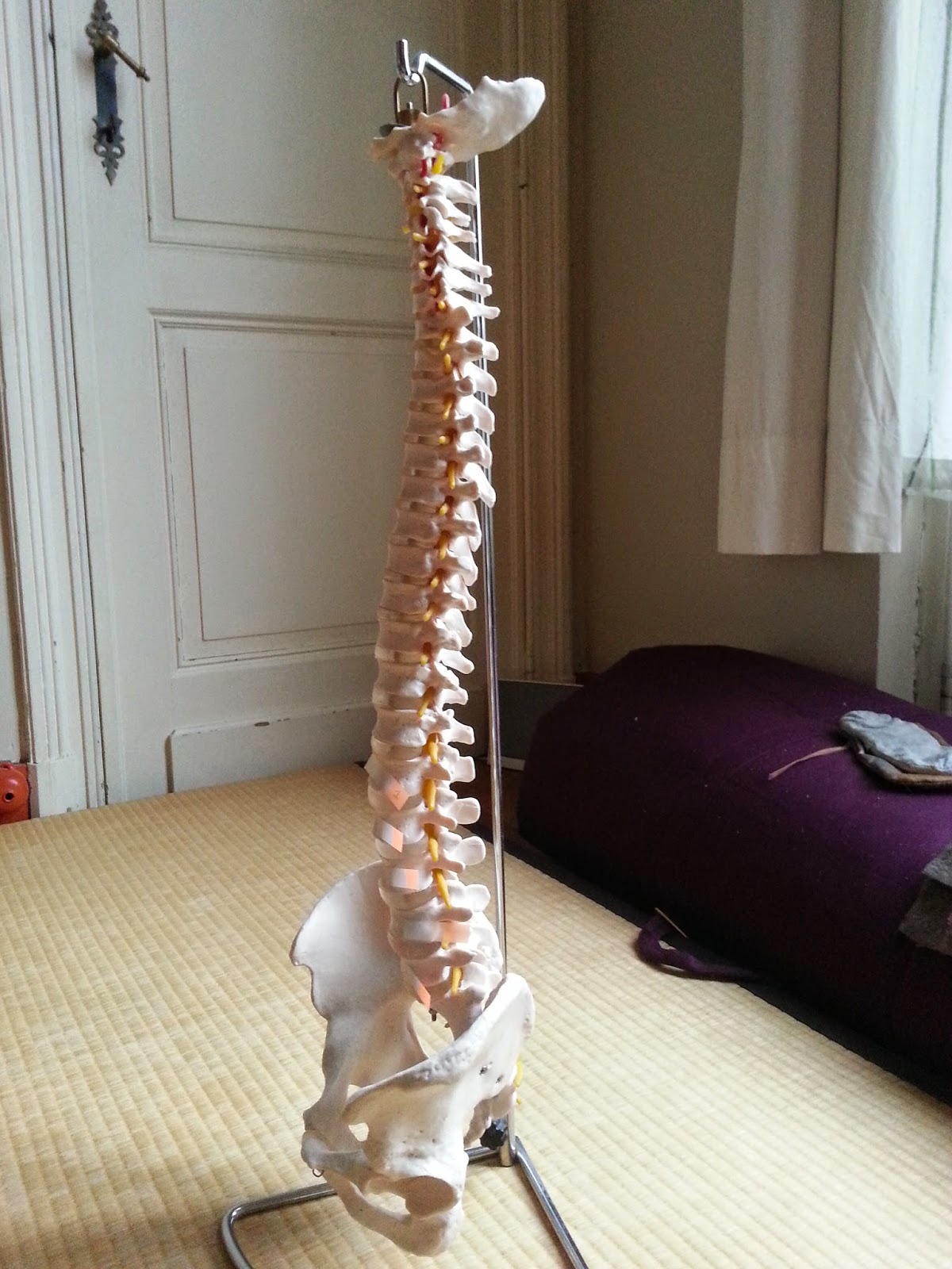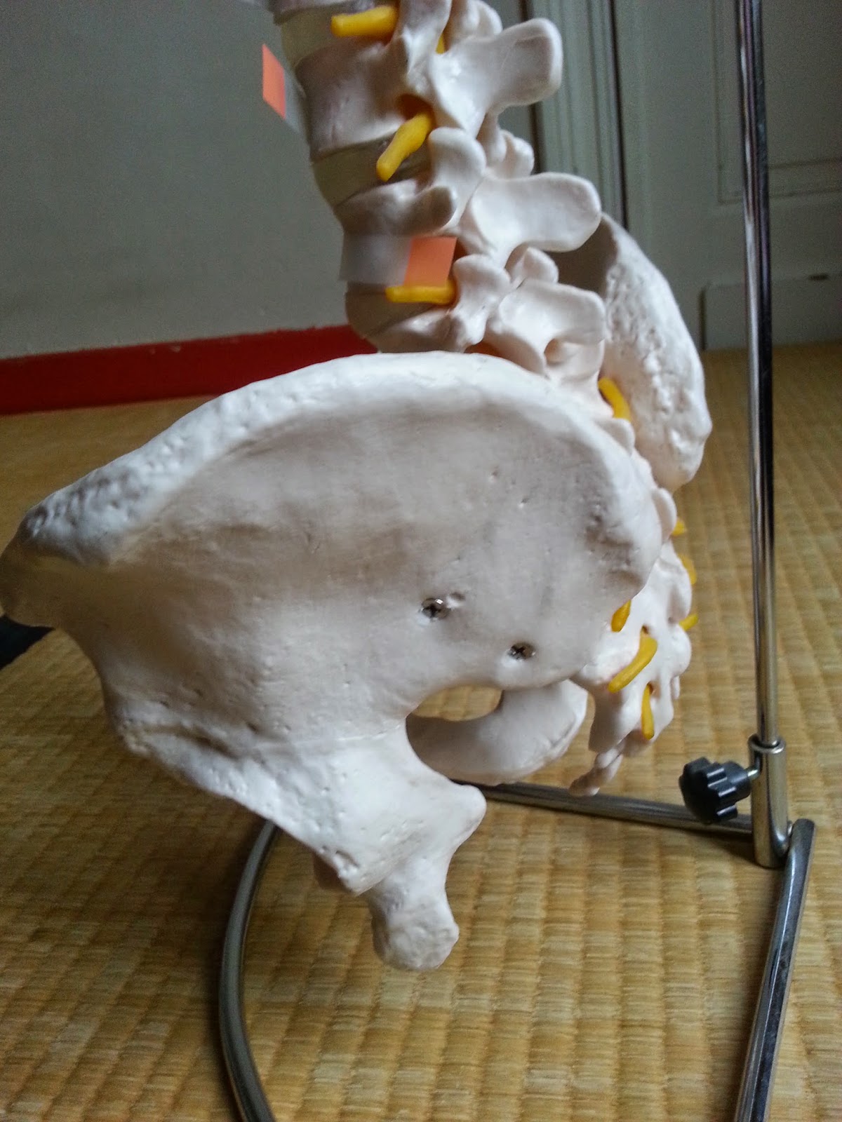 Mon squelette… Pour mieux visualiser et comprendre les enjeux physiques d’une posture … colonne vertébrale bassin vu de face, remarquer pubis et ischions et crêtes iliaques sacrum et 5ième lombaire nuque et base du crâne iliaque bassin